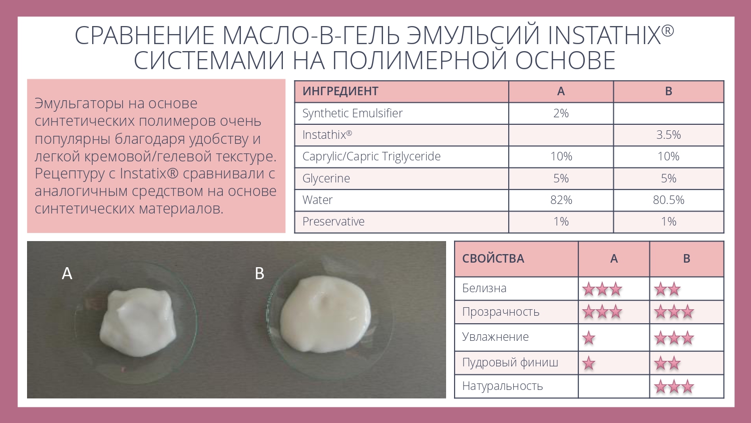 Instathix® представляет собой концентрированную порошковую смесь натуральных эмульгаторов, стабилизаторов и модификаторов текстуры, позволяющую легко получать стабильные эмульсий типа "масло-в-геле". С ним можно создавать как жидкие сыворотки с шелковистой гладкой текстурой, так и более насыщенные и густые кремы и баттеры. Кроме того, этот ингредиент можно использовать для решения проблем, связанных с повышением вязкости или улучшением стабильности и текстуры уже готовых рецептур.